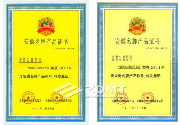 2012年3月22日,马鞍山市召开了全市品质手艺监视任务集会,集会对2011年取得质监部分相干声誉的企业与小我停止了惩处,我公司中德牌液压油缸摆式液压剪板机和中德牌夜压板料折边机两个产物别离经由过程了2011年“安徽名牌”的复审。